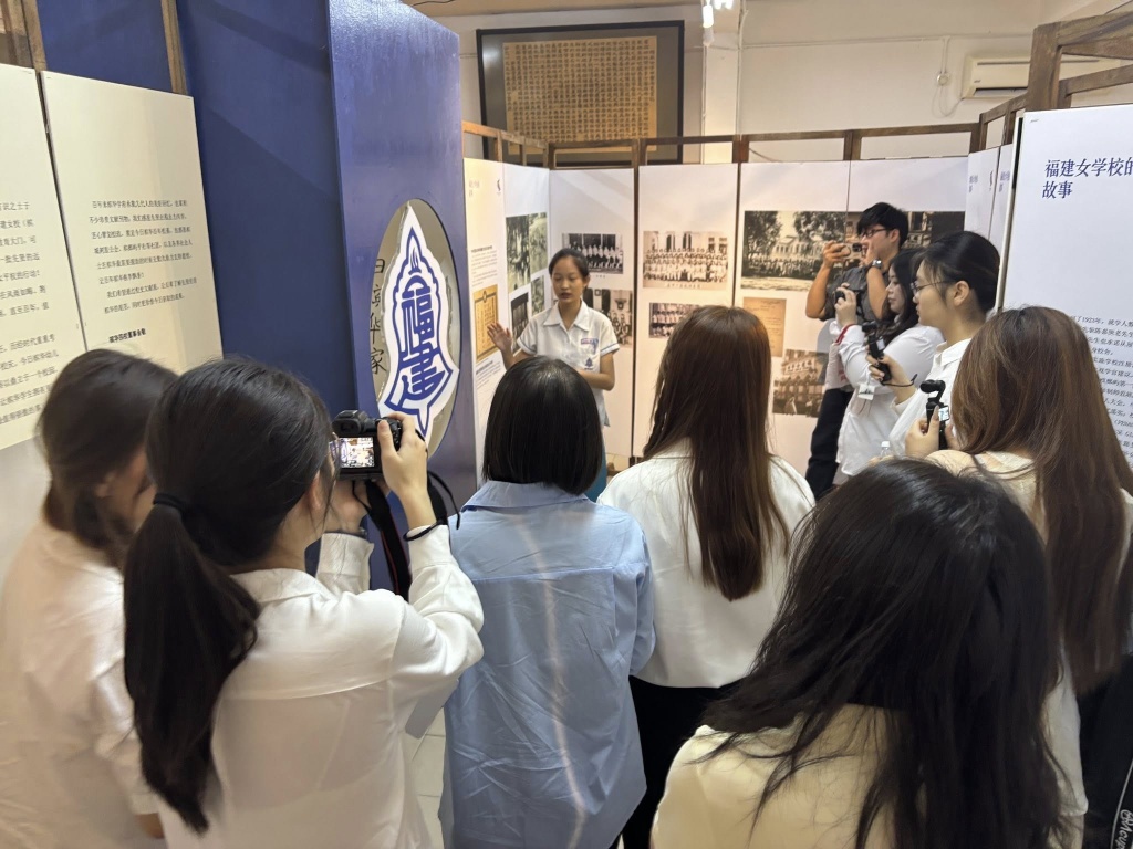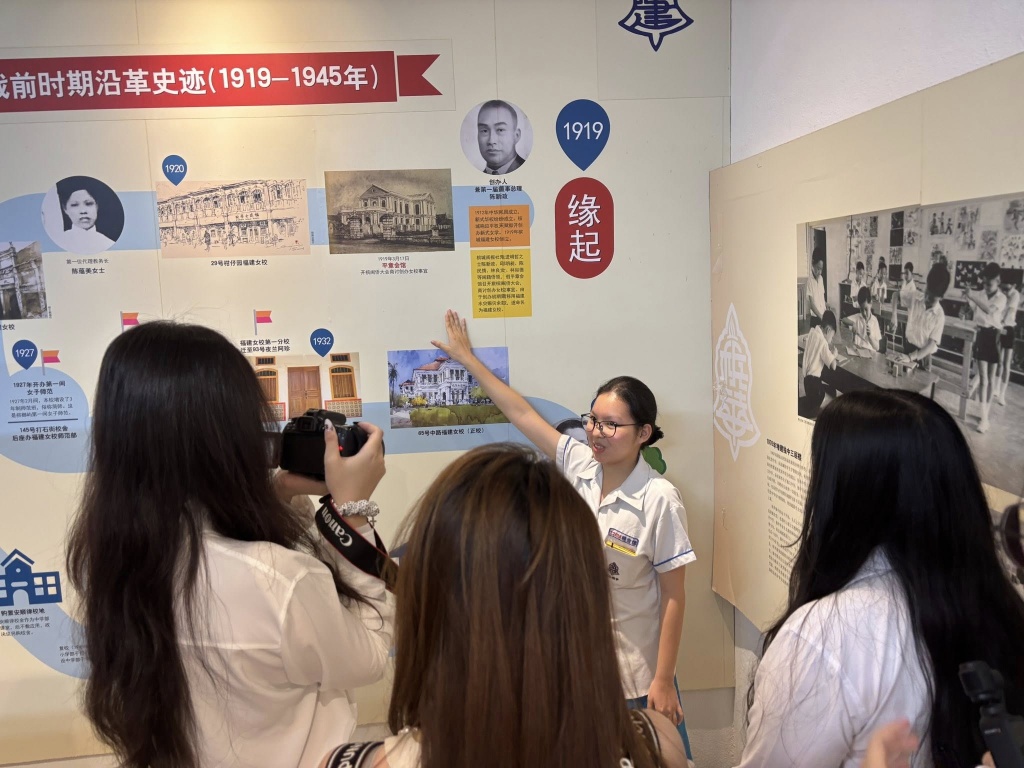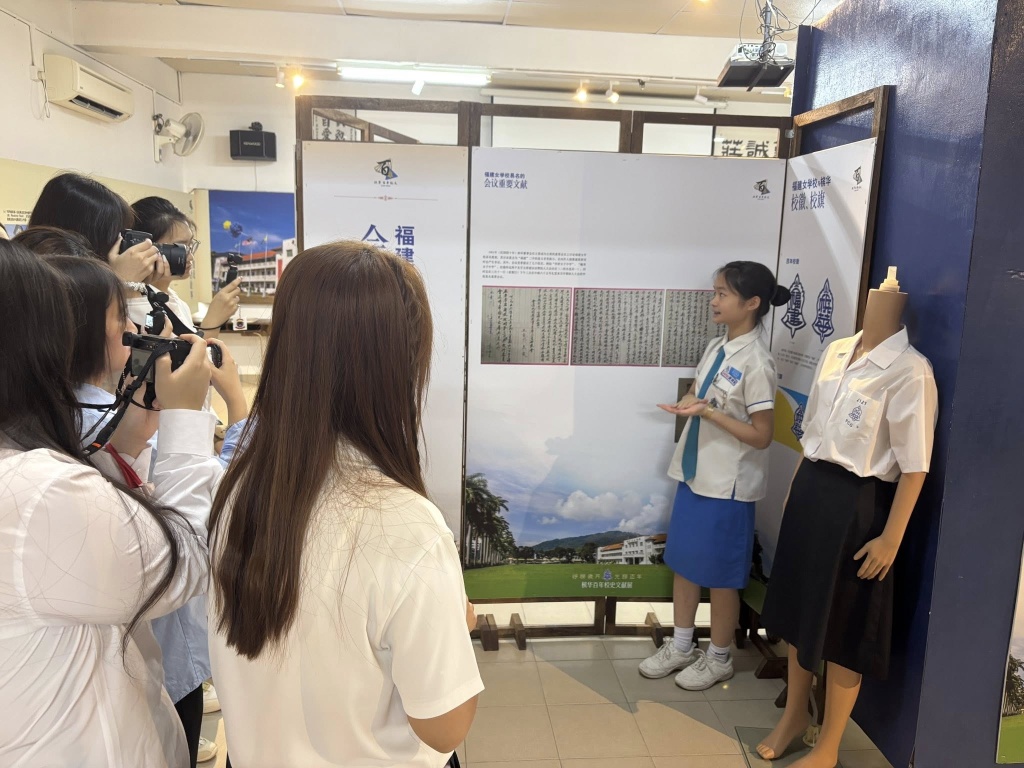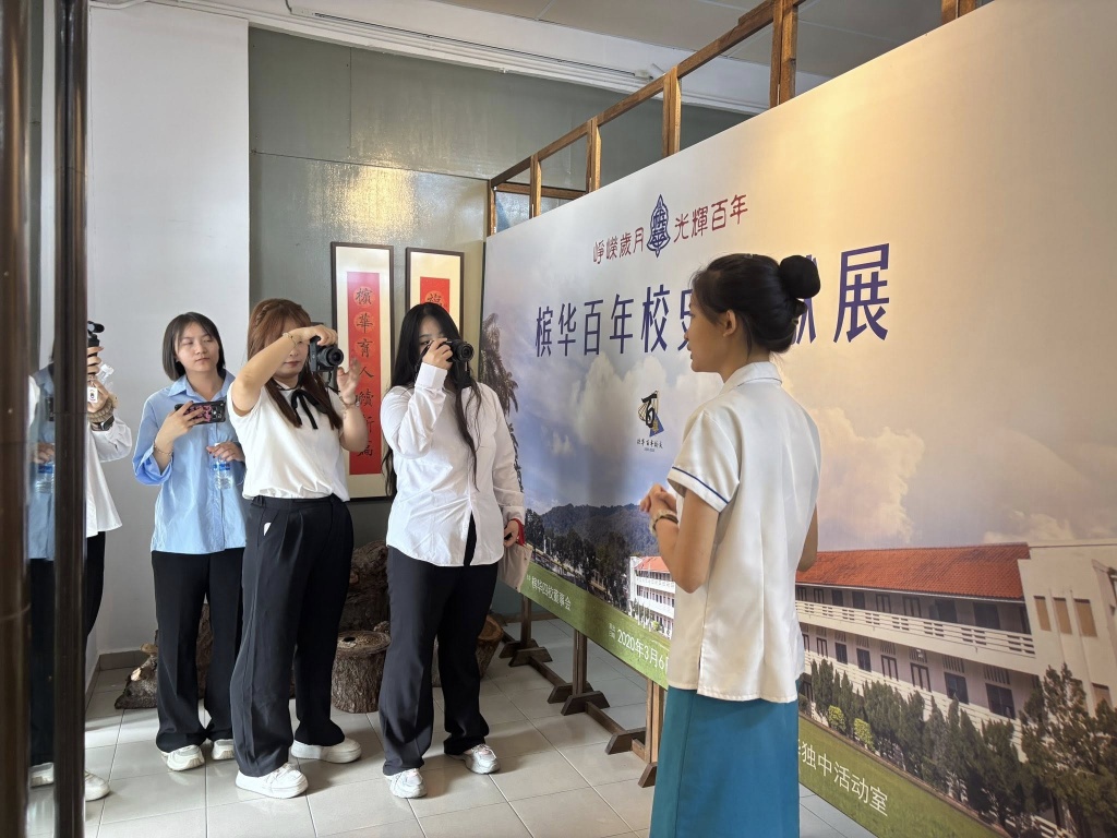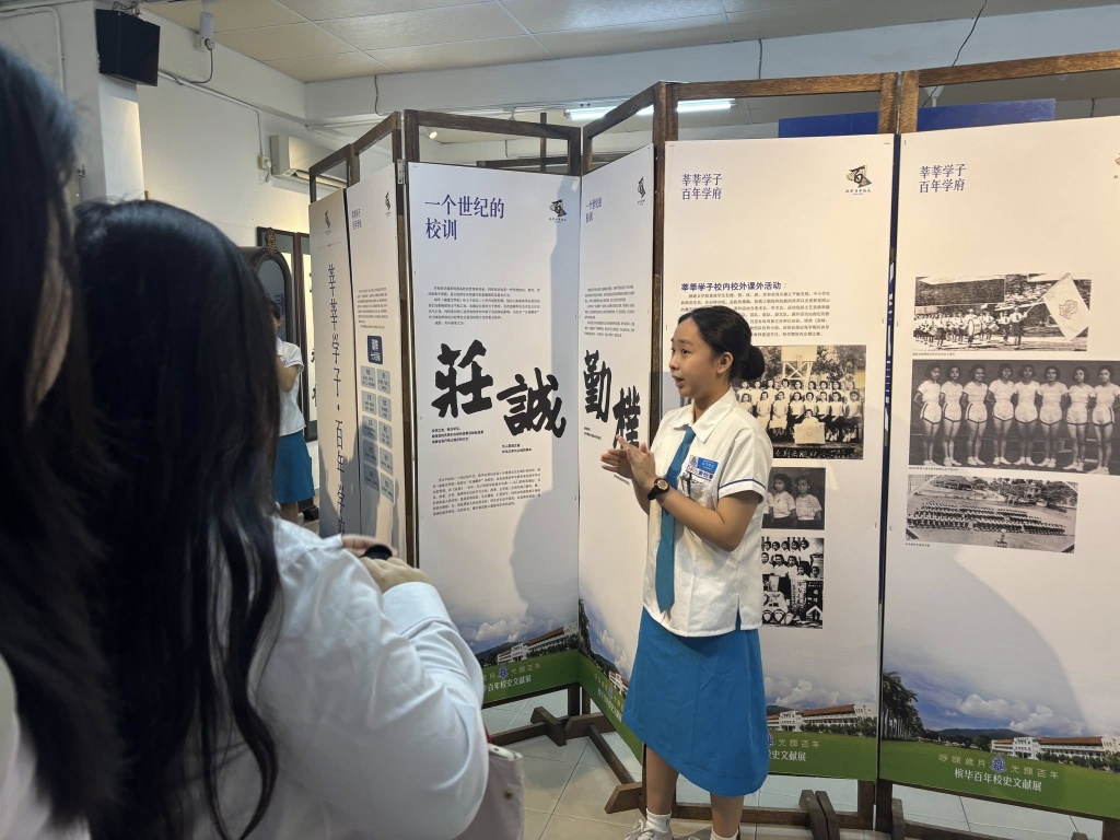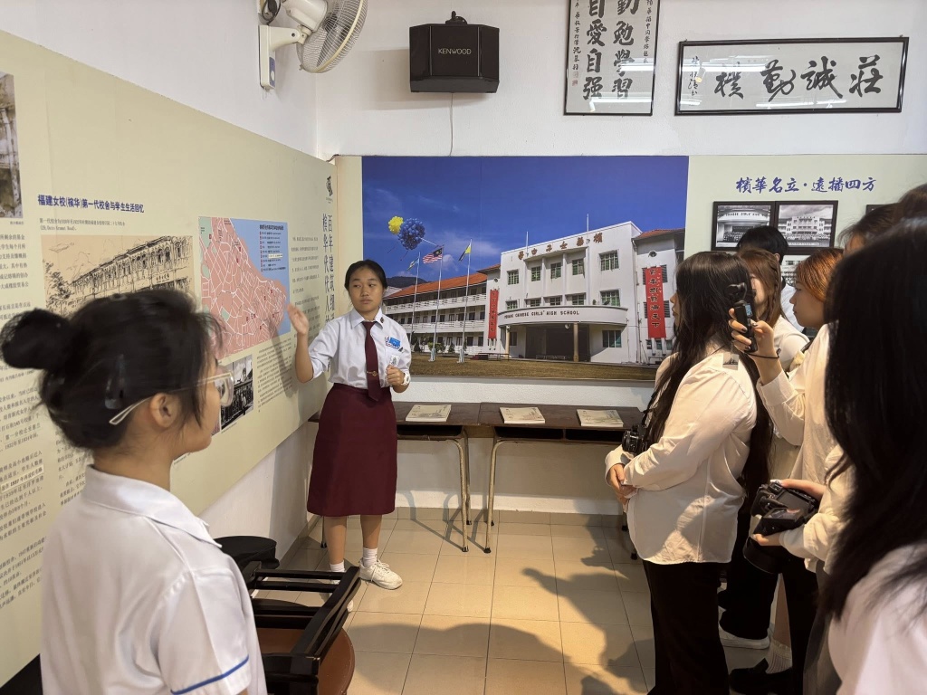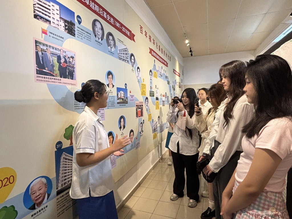 在欢迎仪式后,由槟华引水人(校史讲解员)带领来访师生认识学校的发展简史。此次讲解由本校学生亲自担任,让学生在真实的交流情境中练习表达,也让来宾从学生的视角,更贴近地认识槟华。